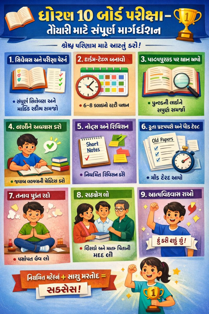 ધોરણ 10 બોર્ડ પરીક્ષાની તૈયારી માટે યોગ્ય યોજના, સતત અભ્યાસ, revision અને આત્મવિશ્વાસ ખૂબ જ જરૂરી છે. એક દિવસમાં બધું શક્ય નથી, પરંતુ રોજ થોડું-થોડું કરશો તો સફળતા ચોક્કસ મળશે.