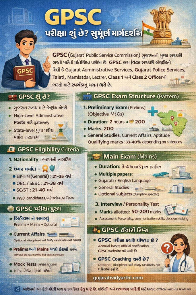આ લેખમાં આપણે GPSC પરીક્ષા વિશે eligibility, exam pattern, syllabus, preparation tips અને અન્ય મહત્વપૂર્ણ માહિતી અંગે વિગતવાર સમજાવશું.
